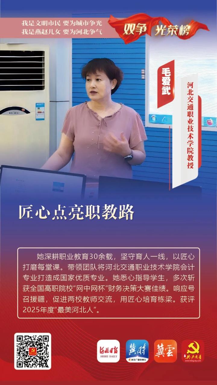 毛爱武,女,中共党员,河北交通职业技术学院教授,经济管理系会计专业教研室主任。她深耕职业教育30余载,坚守育人一线,以匠心打磨每堂课。带领团队将河北交通职业技术学院会计专业打造成国家优质专业。她悉心指导学生,多次斩获全国高职院校“网中网杯”财务决策大赛佳绩。响应号召援疆,促进两校教师交流,用匠心培育栋梁。获评2025年度“最美河北人”。