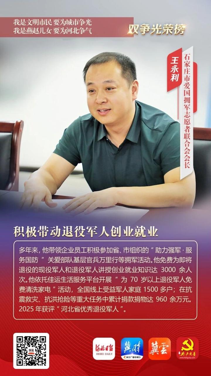 王永利,1977年11月出生,中共党员,1993年12月入伍,2009年12月退役,现任石家庄市爱国拥军志愿者联合会会长。