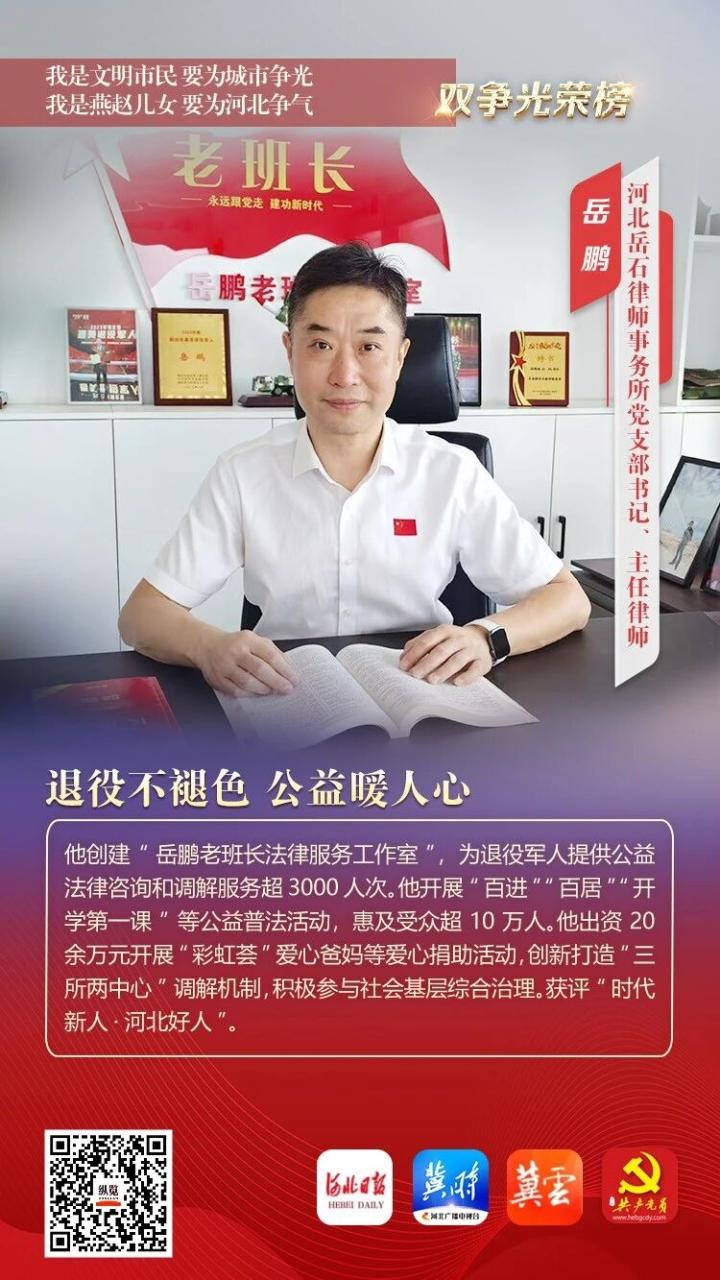 他创建“岳鹏老班长法律服务工作室”,为退役军人提供公益法律咨询和调解服务超3000人次。他开展“百进”“百居”“开学第一课”等公益普法活动,惠及受众超10万人。他出资20余万元开展“彩虹荟”爱心爸妈等爱心捐助活动,创新打造“三所两中心”调解机制,积极参与社会基层综合治理。获评“时代新人·河北好人”。