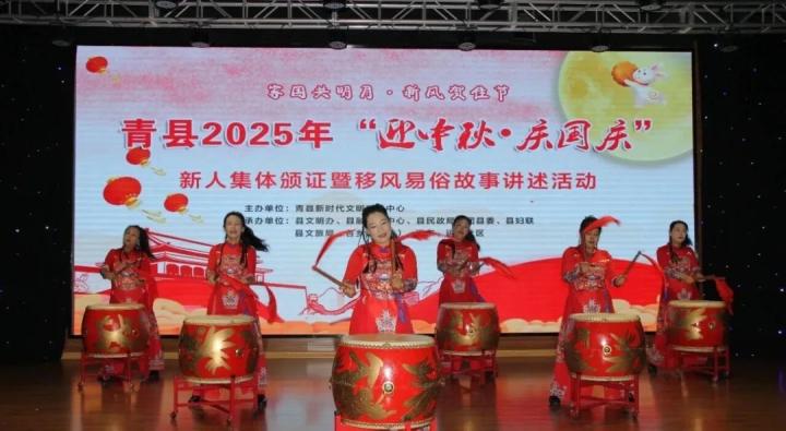 青县举行“迎中秋·庆国庆”新人集体颁证暨移风易俗故事讲述活动,12对新人在证婚人见证下领取结婚证,道德模范分享“零彩礼”“低彩礼”幸福故事,引导青年树立理性婚恋观,弘扬文明婚俗新风。