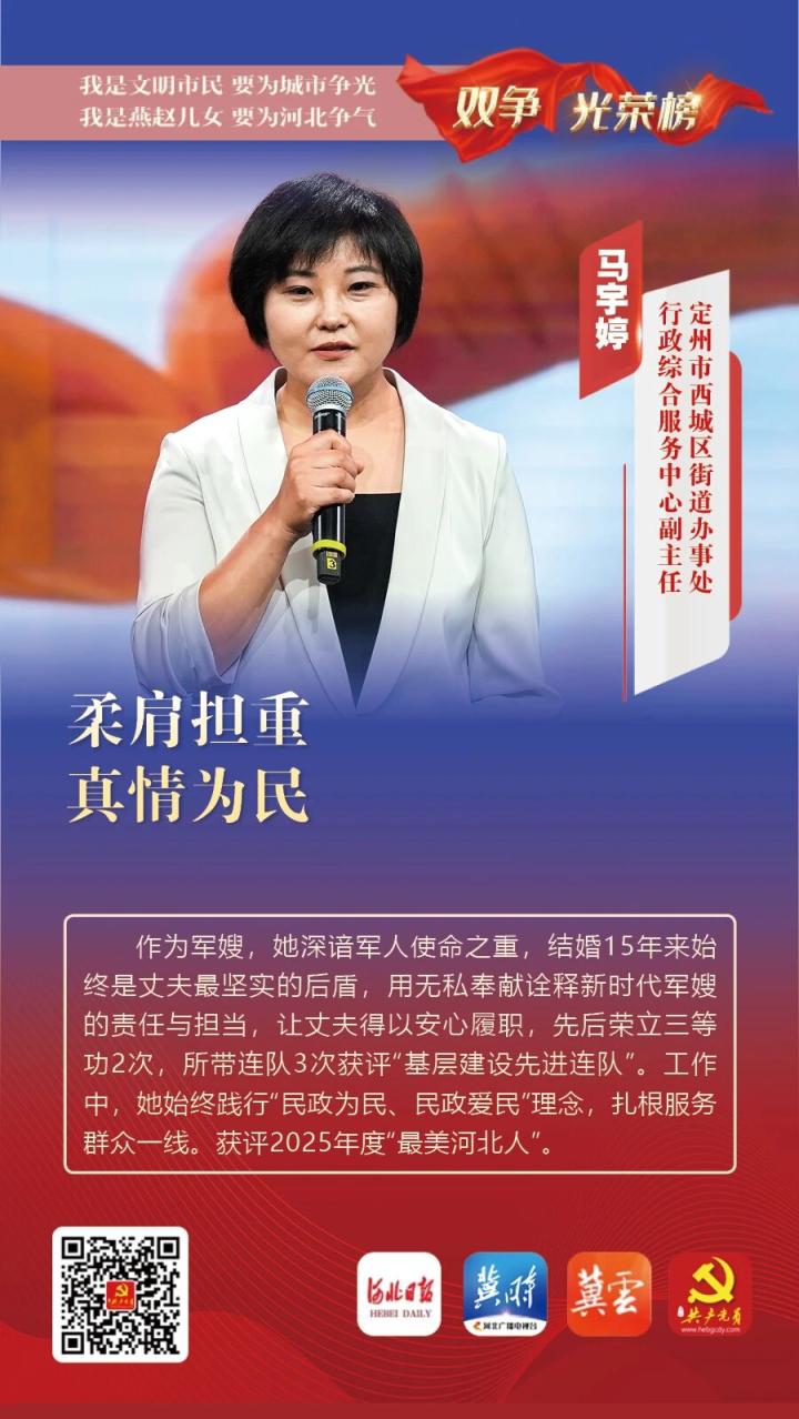 作为军嫂,她深谙军人使命之重,结婚15年来始终是丈夫最坚实的后盾,用无私奉献诠释新时代军嫂的责任与担当,让丈夫得以安心履职,先后荣立三等功2次,所带连队3次获评“基层建设先进连队”。工作中,她始终践行“民政为民、民政爱民”理念,扎根服务群众一线。获评2025年度“最美河北人”。