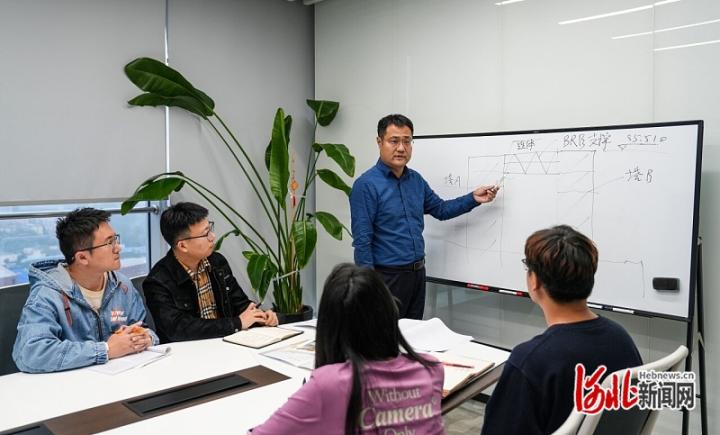 10月10日,郝贵强(左三)与团队研讨项目设计方案。河北日报记者 许佳奇摄