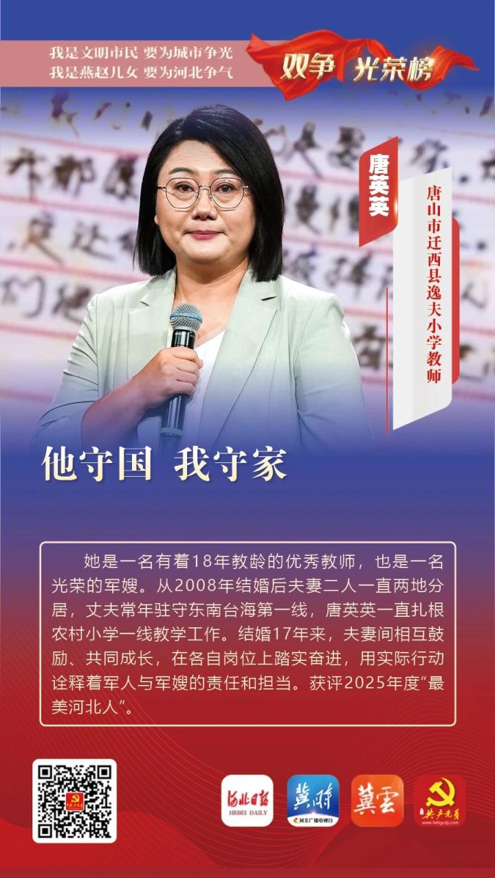 她是一名有着18年教龄的优秀教师,也是一名光荣的军嫂。从2008年结婚后夫妻二人一直两地分居,丈夫常年驻守东南台海第一线,唐英英一直扎根农村小学一线教学工作。结婚17年来,夫妻间相互鼓励、共同成长,在各自岗位上踏实奋进,用实际行动诠释着军人与军嫂的责任和担当。获评2025年度“最美河北人”。