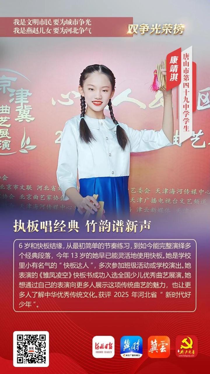 6岁和快板结缘,从最初简单的节奏练习,到如今能完整演绎多个经典段落,今年13岁的她早已能灵活地使用快板。她是学校里小有名气的“快板达人”,多次参加班级活动或学校演出。她表演的《雏凤凌空》快板书成功入选全国少儿优秀曲艺展演。她想通过自己的表演向更多人展示这项传统曲艺的魅力,也让更多人了解中华优秀传统文化。获评2025年河北省“新时代好少年”。