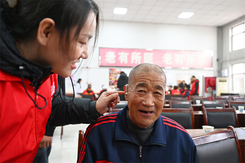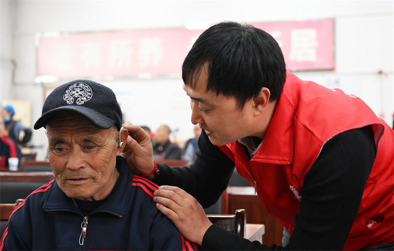 10月24日,志愿者在定州市民政事业服务中心为72岁的听障老人李平均佩戴助听器。