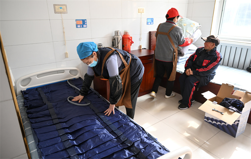 10月24日,定州市民政事业服务中心护理人员为卧床老人换上河北省福彩中心捐赠的防压疮气垫。