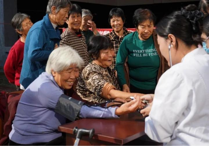 庄窠乡卫生院医护人员为老人量血压(高问 摄)