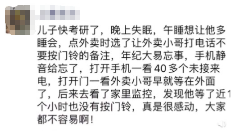 顾客说,备注“不按门铃”是因为小孩考研,压力大睡不好,中午午睡的时候想让他多睡一会。后来有事就忘了外卖,手机又打了静音,直到看到手机上有47个未接电话,才想起来。打开门看到外卖小哥的时候特别不好意思,耽误他时间,心里过意不去,想给他一点补偿,小伙子也没收,看监控发现小伙子在外面等了快一个小时,真的特别感谢他,想跟他说声对不起。外卖小哥则表示,看到备注觉得人家可能有什么特殊情况,就没有按门铃,那地方刚好在电梯口,人比较多,挂在门上又怕被人拿走,就一直等在门口打电话。虽然耽误了送单,但是他觉得不管做什么事情,都得负责任,送一单就要对这一单负责到底。