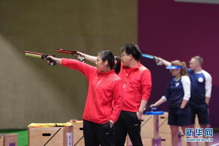 7月27日,中国选手姜冉馨(左一)和庞伟(左二)在比赛中。当日,在东京奥运会10米气手枪混合团体决赛中,中国选手姜冉馨和庞伟夺冠。