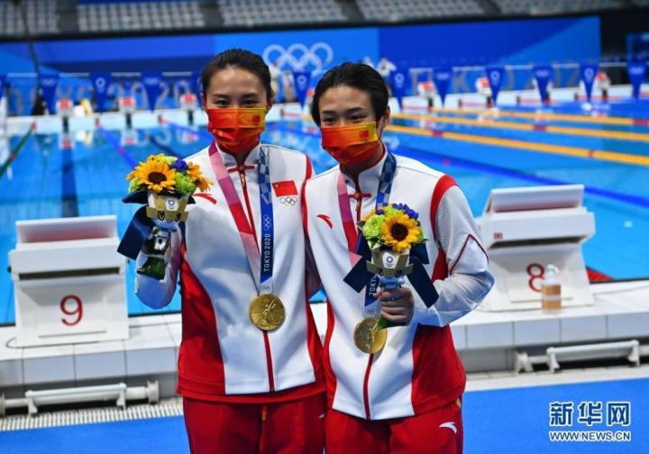 7月25日,中国选手王涵(左)和施廷懋在合影。当日,在东京奥运会跳水女子双人三米跳板决赛中,施廷懋/王涵夺得冠军。新华社记者 许畅 摄