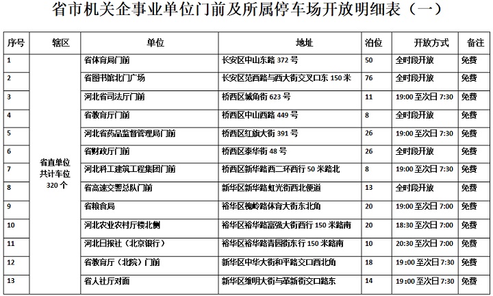 本次发布的37个停车场,能够为广大市民提供近1900个停车位。其中省体育馆、裕彤体育场2个停车场848个泊位夜间以非定时价格向市民开放,省司法厅门前等19个停车场实行分时段错时共享,其余16个停车场全时段供市民停车选择。今后,石家庄市还将陆续发布涉及停车管理的便民利民新举措。