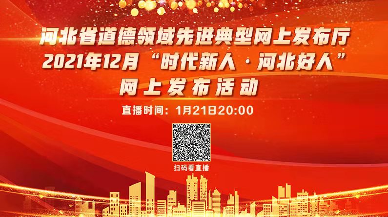 1月21日晚8点,河北省精神文明建设委员会办公室将在“冀云·河北省道德领域先进典型网上发布厅”发布2021年12月“时代新人·河北好人”。实时收看直播,让我们一起聆听身边好人的故事,一起向好人致敬、与榜样同行。