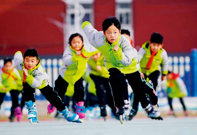冬奥会点燃火热冰雪激情——河北省3000万人参与冰雪运动。图为2021年12月15日,河北省滦州市第三实验小学的学生们在体育课上练习轮滑。图/新华社记者 杨世尧 摄