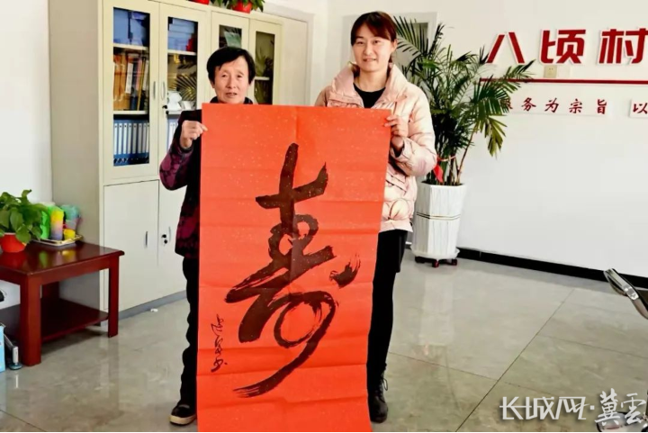 八顷村文明实践站工作人员为老人送上“寿”字。