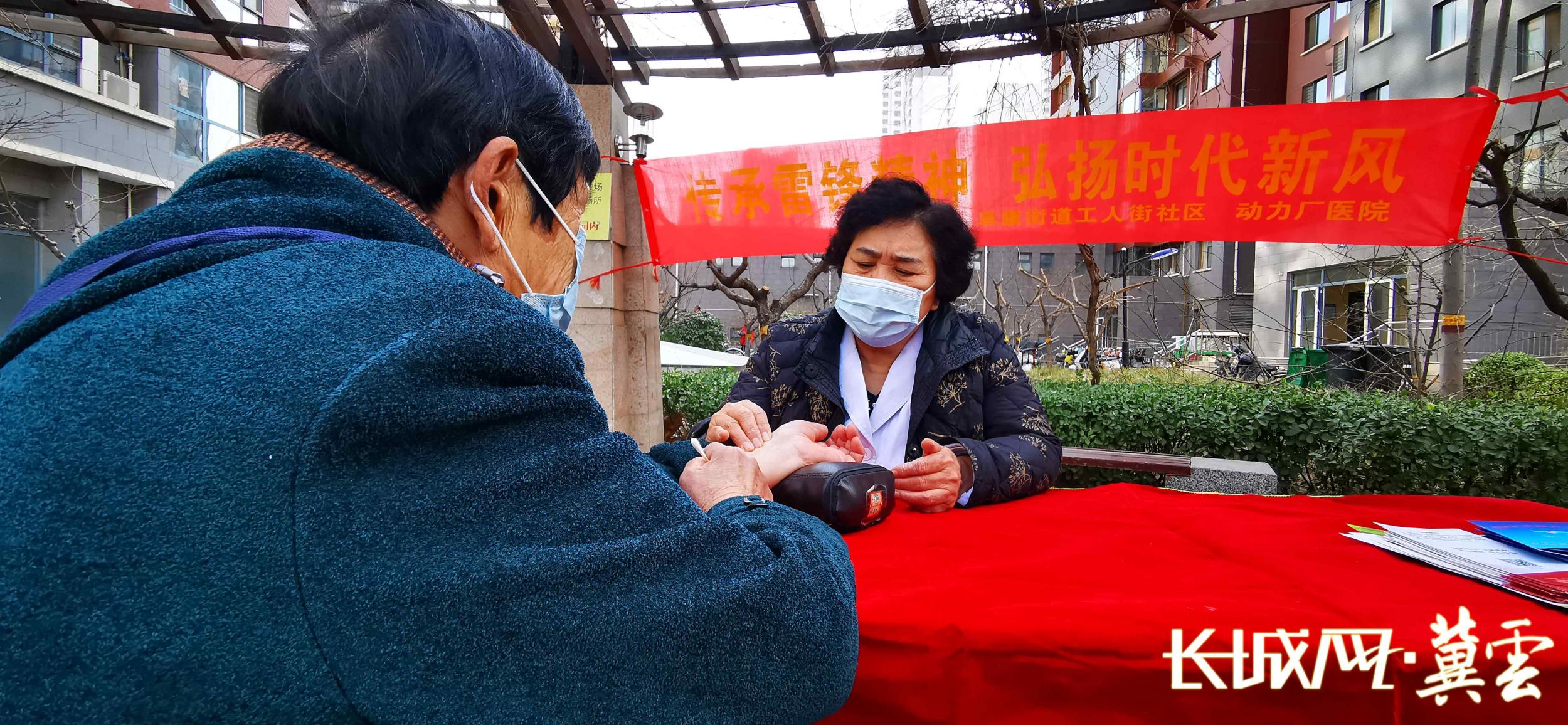 雷锋志愿者正在为社区居民免费义诊。