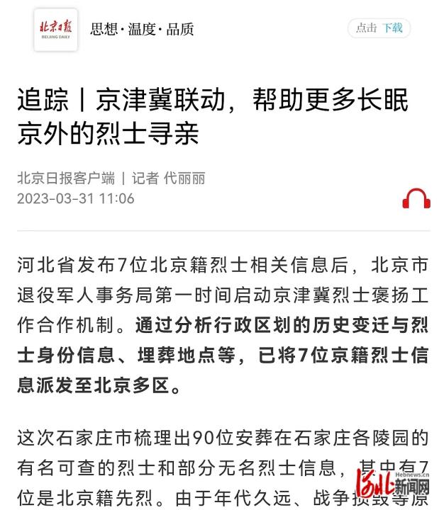纵览客户端发布的烈士寻亲名单中,有7位北京籍烈士的信息。北京日报客户端3月30日刊发了“一起为七位北京籍烈士寻亲”的报道后,北京市退役军人事务局第一时间启动京津冀烈士褒扬工作合作机制。通过分析行政区划的历史变迁与烈士身份信息、埋葬地点等,已将7位京籍烈士信息派发至北京多区。