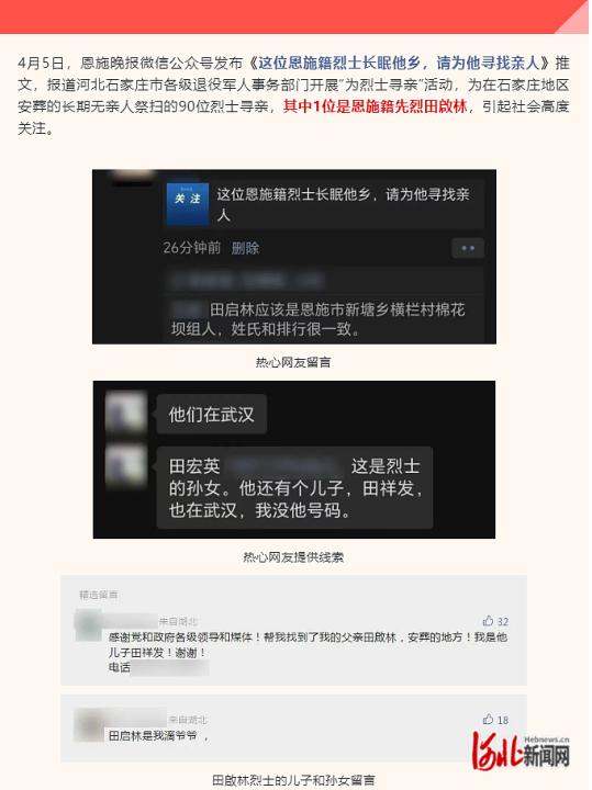 近日,燕赵都市报纵览新闻发布了《为90位长眠石家庄的烈士寻亲》以及《这90位烈士长眠石家庄,来自全国17个省市38位是河北人,一起为他们寻亲》,为90位烈士寻亲,其中1位是湖北恩施籍。看到燕赵都市报纵览新闻的报道后,4月5日,恩施晚报微信公众号发布《这位恩施籍烈士长眠他乡,请为他寻找亲人》推文,为在石家庄安葬的恩施籍烈士田启林寻亲。