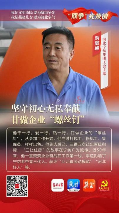 刘敬通,男,67岁,中共党员,河北宁纺集团工会主席。