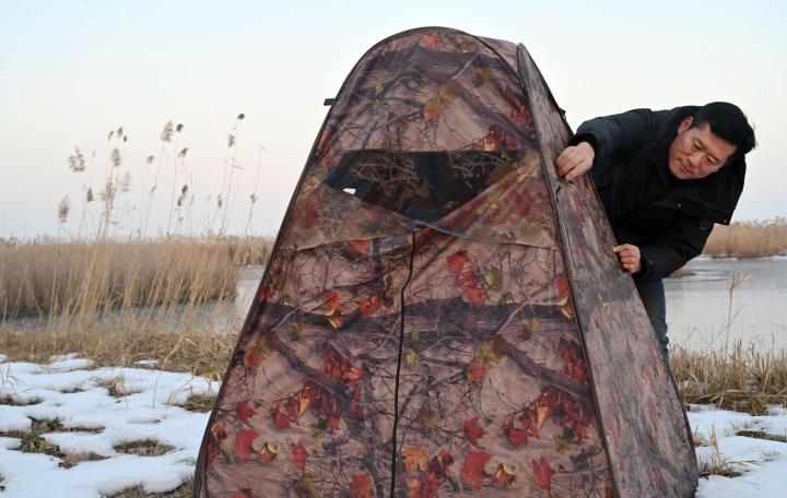 1月5日,白洋淀“鸟叔”韩战桥在淀边搭起帐篷,准备开始他的野外鸟类观测、巡护工作。 河北日报见习记者 刘光昱摄