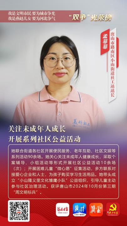 孟菲菲,女,唐山市路南区小山街道社工站站长。她联合街道各社区开展便民服务、老年互助、社区文娱等系列活动90余场。她关心关注未成年人健康成长,采取个案辅导、小组活动等形式开展社区公益活动10余场(次);开展困难儿童“微心愿”征集活动,多方联系对接爱心企业和人士,为孩子购买学习生活用品。她带头成立“小山隆义里文化雏鹰小队”公益组织,引导儿童主动参与社区治理活动。获评唐山市2024年10月份第三期“周文明标兵”。