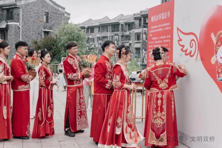 集体婚礼上8对新人在婚俗改革倡议书上签名