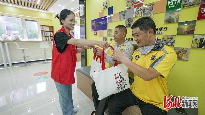 在雄安新区罗河社区24小时暖心驿站,社区工作人员为外卖员送上防暑礼包。