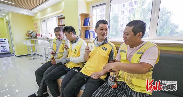 罗河社区24小时暖心驿站内,外卖员在充电间歇聊天休息。