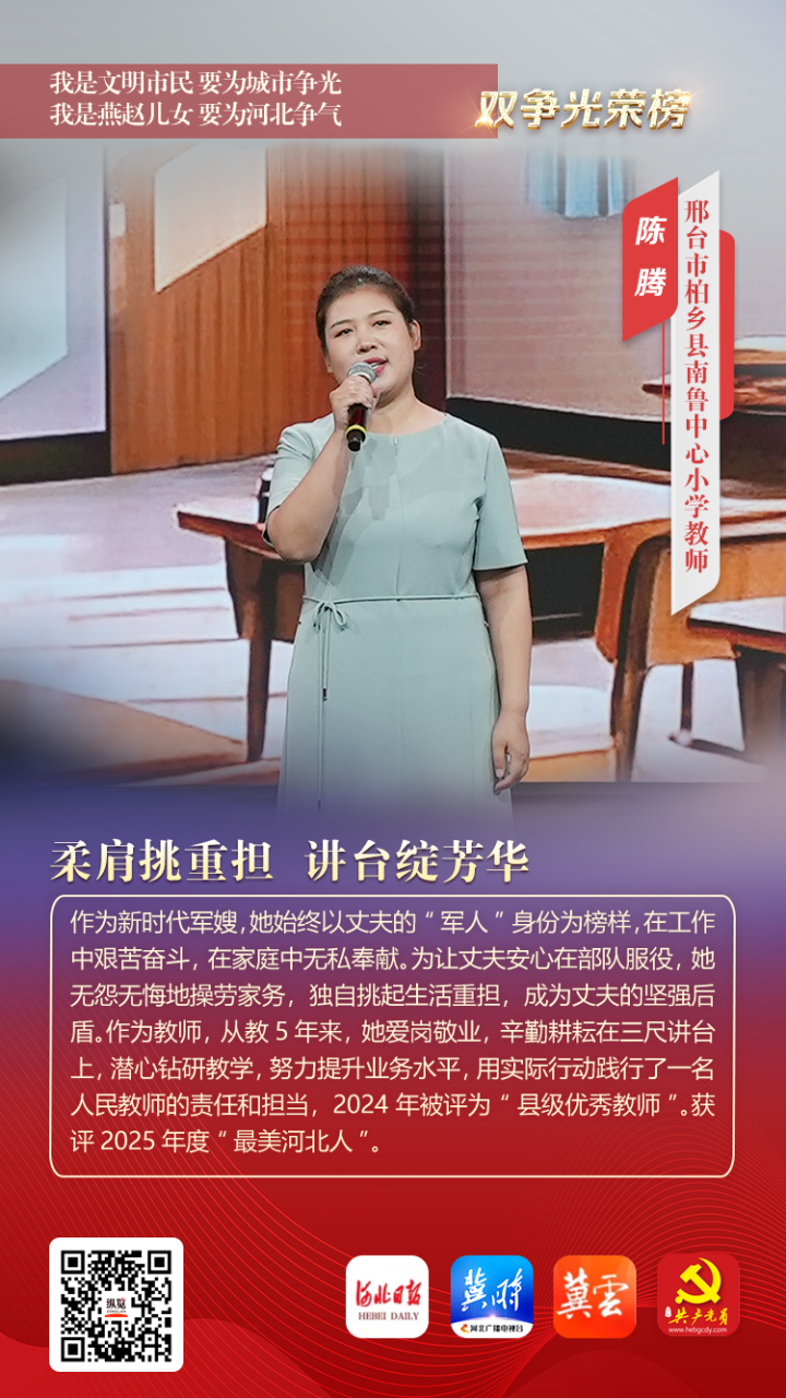 作为新时代军嫂,她始终以丈夫的“军人”身份为榜样,在工作中艰苦奋斗,在家庭中无私奉献。为让丈夫安心在部队服役,她无怨无悔地操劳家务,独自挑起生活重担,成为丈夫的坚强后盾。作为教师,从教5年来,她爱岗敬业,辛勤耕耘在三尺讲台上,潜心钻研教学,努力提升业务水平,用实际行动践行了一名人民教师的责任和担当,2024年被评为“县级优秀教师”。获评2025年度“最美河北人”。