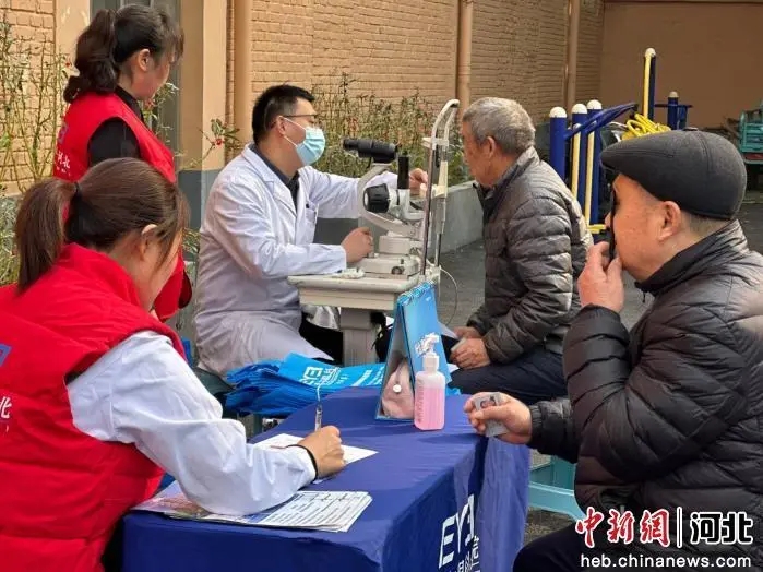 图为鸡泽县重阳节“爱老敬老”活动现场,医务志愿者们正在为老人检查视力。 田杏娇 摄