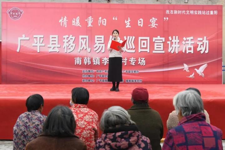 在广平县,文艺汇演融入移风易俗宣讲,胜营镇、广平镇、十里铺镇、南韩镇的宣讲员,分别为大家讲述了八年来悉心照料小脑萎缩婆婆,和丈夫外出工作时带着婆婆同吃同住,深深将孝老爱亲的责任扛在肩上的王瑞霞事迹;主动取消订婚宴、践行婚事新办文明风尚,婚后相互支持,孝顺父母的郭静涛、郑凤杰夫妇事迹;主动摒弃高价彩礼、大操大办的陈规陋习,以简约而庄重的汉服婚礼践行文明新风的郝子凯、王勤夫妇事迹;三十年来精心照料瘫痪婆婆,耐心开导老人情绪,年年荣获“好媳妇”荣誉称号的李九香事迹。一个个发生在大家身边的真实故事,引发在场群众强烈共鸣。