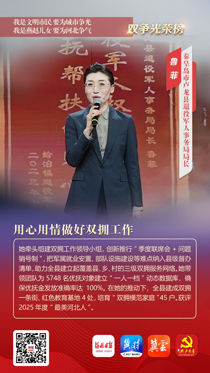 鲁菲,女,秦皇岛市卢龙县退役军人事务局局长。她牵头组建双拥工作领导小组,创新推行“季度联席会+问题销号制”,把军属就业安置、部队设施建设等难点纳入县级督办清单,助力全县建立起覆盖县、乡、村的三级双拥服务网络。她带领团队为5748名优抚对象建立“一人一档”动态数据库,确保优抚金发放准确率达100%。 在她的推动下,全县建成双拥一条街、红色教育基地4处,培育“双拥模范家庭”45户。获评2025年度“最美河北人”。
