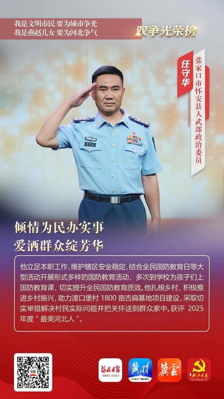 他立足本职工作,维护辖区安全稳定,结合全民国防教育日等大型活动开展形式多样的国防教育活动,多次到学校为孩子们上国防教育课,切实提升全民国防教育质效。他扎根乡村,积极推进乡村振兴,助力渡口堡村1800亩杏扁基地项目建设,采取切实举措解决村民实际问题并把关怀送到群众家中。获评2025年度“最美河北人”。