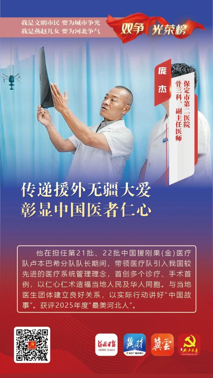 庞杰,男,中共党员,保定市第二医院骨三科、副主任医师。他在担任第21批、22批中国援刚果(金)医疗队卢本巴希分队队长期间,带领医疗队引入我国较先进的医疗系统管理理念,首创多个诊疗、手术首例,以仁心仁术造福当地人民及华人同胞。与当地医生团体建立良好关系,以实际行动讲好“中国故事”。获评2025年度“最美河北人”。