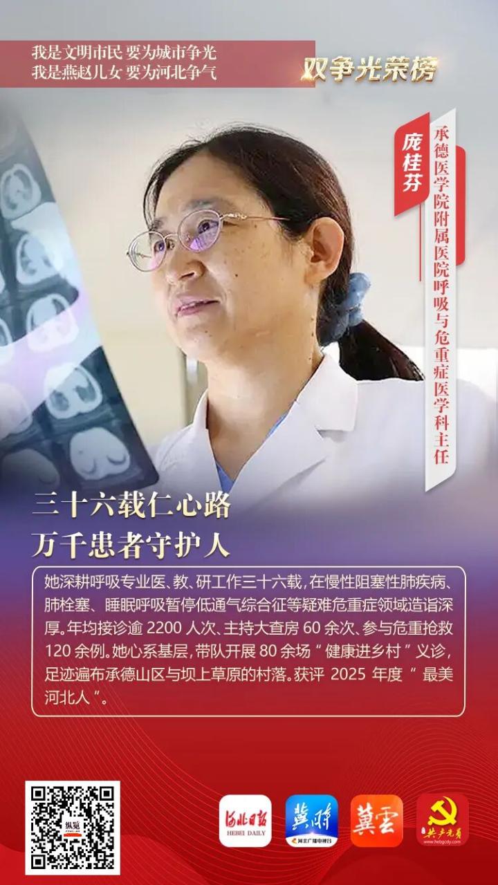 庞桂芬,中共党员,承德医学院附属医院呼吸与危重症医学科主任、主任医师。她深耕呼吸专业医、教、研工作三十六载,在慢性阻塞性肺疾病、肺栓塞、睡眠呼吸暂停低通气综合征等疑难危重症领域造诣深厚。年均接诊逾2200人次、主持大查房60余次、参与危重抢救120余例。她心系基层,带队开展80余场“健康进乡村”义诊,足迹遍布承德山区与坝上草原的村落。获评2025年度“最美河北人”。