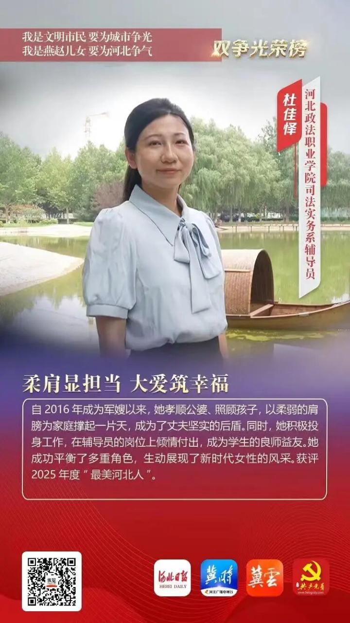 杜佳怿,河北政法职业学院司法实务系辅导员。自2016年成为军嫂以来,她孝顺公婆、照顾孩子,以柔弱的肩膀为家庭撑起一片天,成为了丈夫坚实的后盾。同时,她积极投身工作,在辅导员的岗位上倾情付出,成为学生的良师益友。她成功平衡了多重角色,生动展现了新时代女性的风采。获评2025年度“最美河北人”。