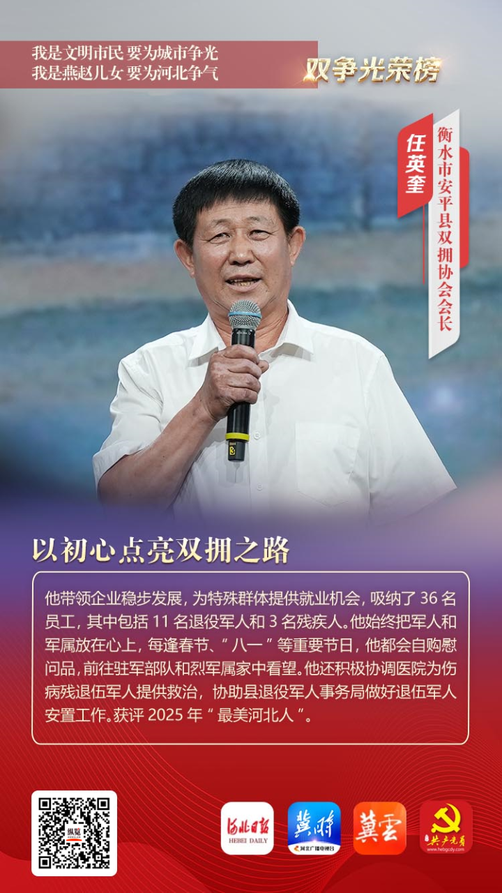 任英奎,1965年7月出生,中共党员,安平县金强拔丝厂厂长,衡水市安平县双拥协会会长。他带领企业稳步发展,为特殊群体提供就业机会,吸纳了36名员工,其中包括11名退役军人和3名残疾人。他始终把军人和军属放在心上,每逢春节、“八一”等重要节日,他都会自购慰问品,前往驻军部队和烈军属家中看望。他还积极协调医院为伤病残退伍军人提供救治,协助县退役军人事务局做好退伍军人安置工作。获评2025年“最美河北人”。