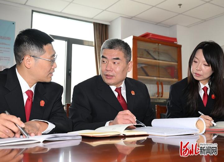 11月17日,邱振刚(中)与同事一起讨论案情。河北日报记者 史晟全摄