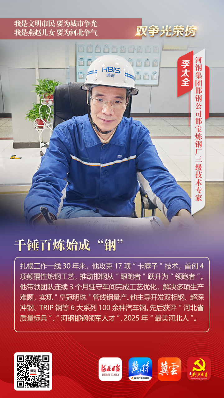 李太全,男,中共党员,河钢集团邯钢公司邯宝炼钢厂三级技术专家。扎根工作一线30年来,他攻克17项“卡脖子”技术,首创4项颠覆性炼钢工艺,推动邯钢从“跟跑者”跃升为“领跑者”。他带领团队连续3个月驻守车间完成工艺优化,解决多项生产难题,实现"皇冠明珠"管线钢量产。他主导开发双相钢、超深冲钢、TRIP钢等6大系列100余种汽车钢。先后获评“河北省质量标兵”、“河钢邯钢领军人才”、2025年“最美河北人”。