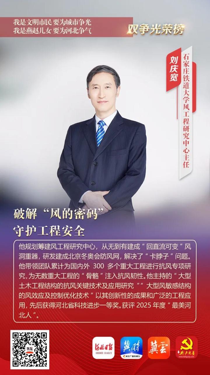 刘庆宽,男,中共党员,石家庄铁道大学风工程研究中心主任。他规划筹建风工程研究中心,从无到有建成“回直流可变”风洞重器,研发建成北京冬奥会防风网,解决了“卡脖子”问题。他带领团队累计为国内外300多个重大工程进行抗风专项研究,为无数重大工程的“骨骼”注入抗风韧性。他主持的“大型土木工程结构的抗风关键技术及应用研究”“大型风敏感结构的风效应及控制优化技术”以其创新性的成果和广泛的工程应用,先后获得河北省科技进步一等奖。获评2025年度“最美河北人”。