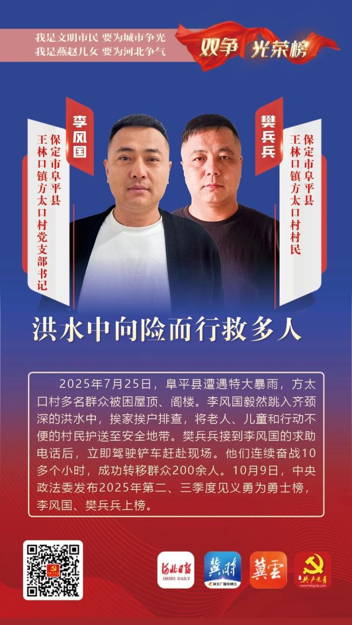 李风国,男,1982年9月出生,保定市阜平县王林口镇方太口村党支部书记;樊兵兵,男,1990年4月出生,保定市阜平县王林口镇方太口村村民。2025年7月25日,阜平县遭遇特大暴雨,方太口村多名群众被困屋顶、阁楼。李风国毅然跳入齐颈深的洪水中,挨家挨户排查,将老人、儿童和行动不便的村民护送至安全地带。樊兵兵接到李风国的求助电话后,立即驾驶铲车赶赴现场。他们连续奋战10多个小时,成功转移群众200余人。10月9日,中央政法委发布2025年第二、三季度见义勇为勇士榜,李风国、樊兵兵上榜。
