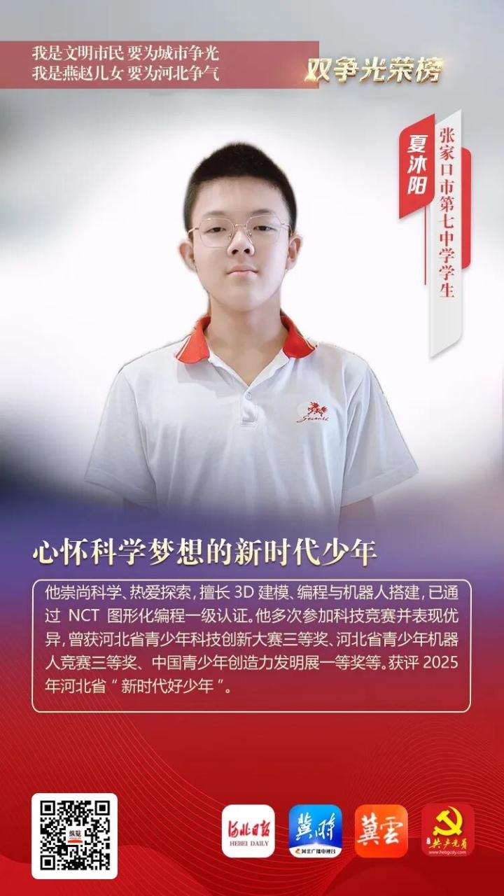 夏沐阳,男,2012年2月出生,张家口市第七中学学生。他崇尚科学、热爱探索,擅长3D建模、编程与机器人搭建,已通过NCT图形化编程一级认证。他多次参加科技竞赛并表现优异,曾获河北省青少年科技创新大赛三等奖、河北省青少年机器人竞赛三等奖、中国青少年创造力发明展一等奖等。获评2025年河北省“新时代好少年”。