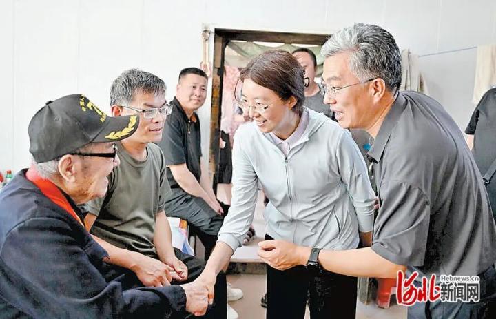 6月21日,戚辉(右一)在滦州市九百户村为抗战老兵王玉堂介绍唐山公益摄影团队的成员。
