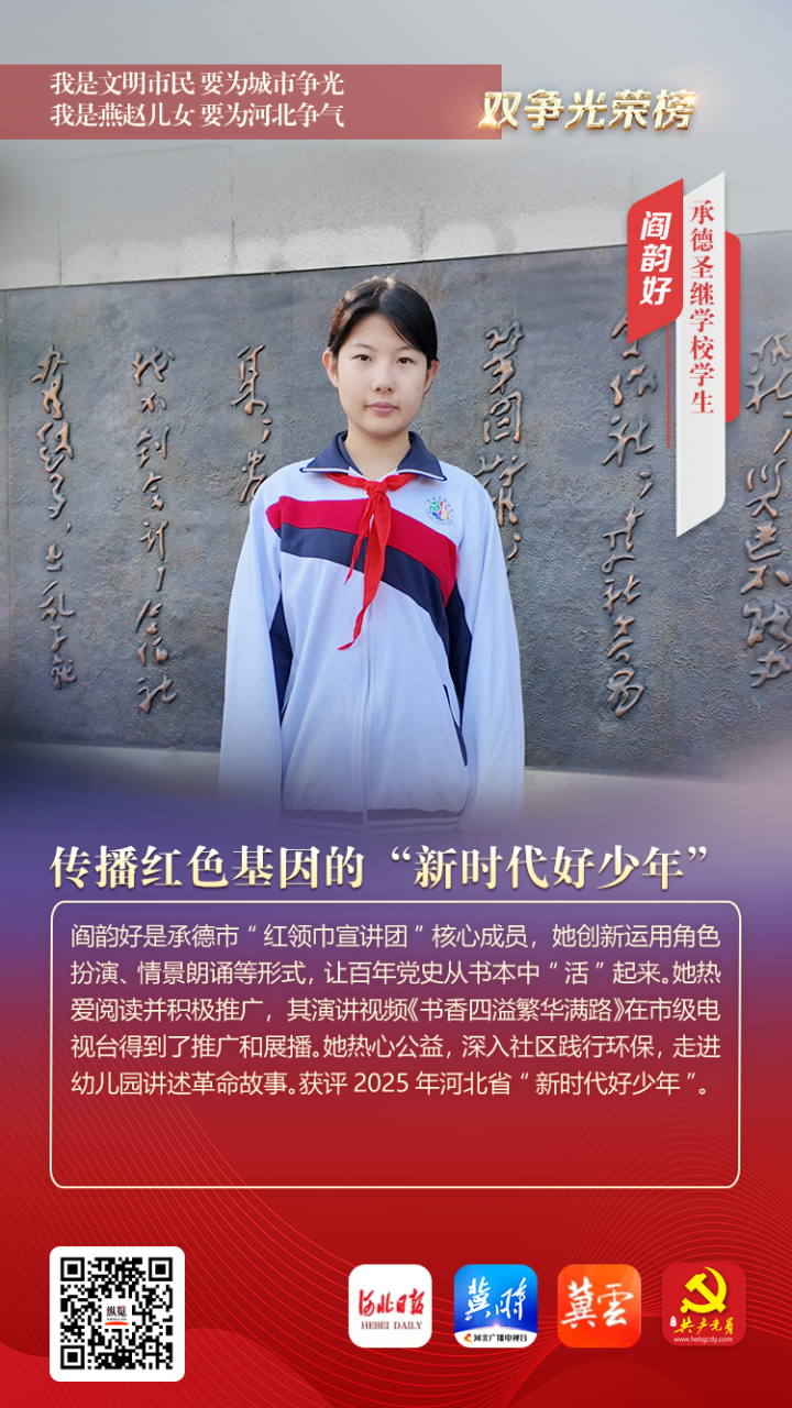 阎韵好是承德市“红领巾宣讲团”核心成员,她创新运用角色扮演、情景朗诵等形式,让百年党史从书本中“活”起来。她热爱阅读并积极推广,其演讲视频《书香四溢繁华满路》在市级电视台得到了推广和展播。她热心公益,深入社区践行环保,走进幼儿园讲述革命故事。获评2025年河北省“新时代好少年”。