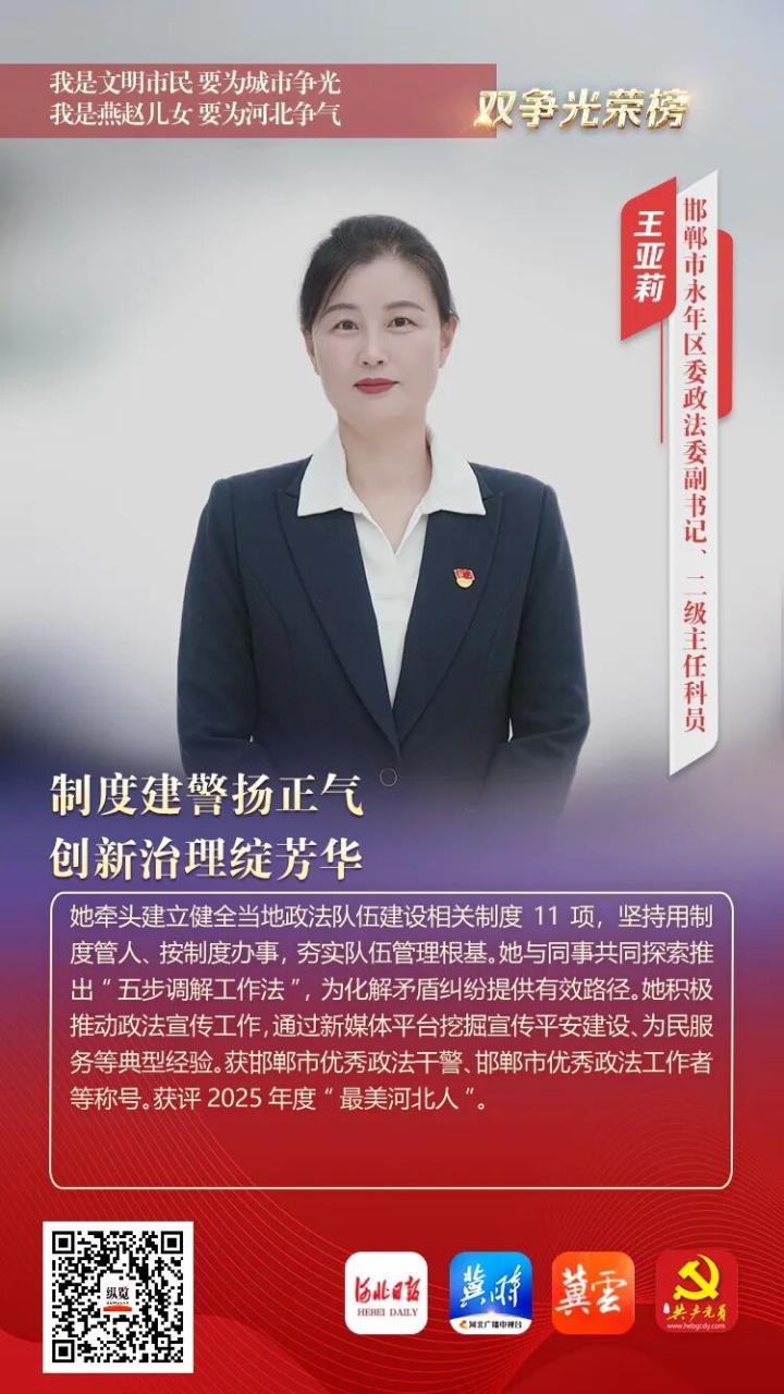 王亚莉,中共党员,邯郸市永年区委政法委副书记、二级主任科员。她牵头建立健全当地政法队伍建设相关制度11项,坚持用制度管人、按制度办事,夯实队伍管理根基。她与同事共同探索推出“五步调解工作法”,为化解矛盾纠纷提供有效路径。她积极推动政法宣传工作,通过新媒体平台挖掘宣传平安建设、为民服务等典型经验。获邯郸市优秀政法干警、邯郸市优秀政法工作者等称号。获评2025年度“最美河北人”。