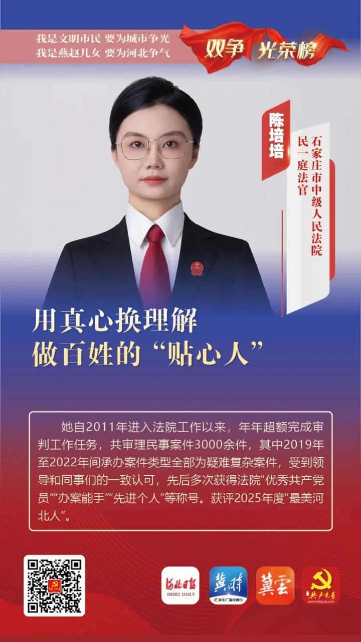 陈培培,女,中共党员,石家庄市中级人民法院民一庭法官。她自2011年进入法院工作以来,年年超额完成审判工作任务,共审理民事案件3000余件,其中2019年至2022年间承办案件类型全部为疑难复杂案件,受到领导和同事们的一致认可,先后多次获得法院“优秀共产党员”“办案能手”“先进个人”等称号。获评2025年度“最美河北人”。