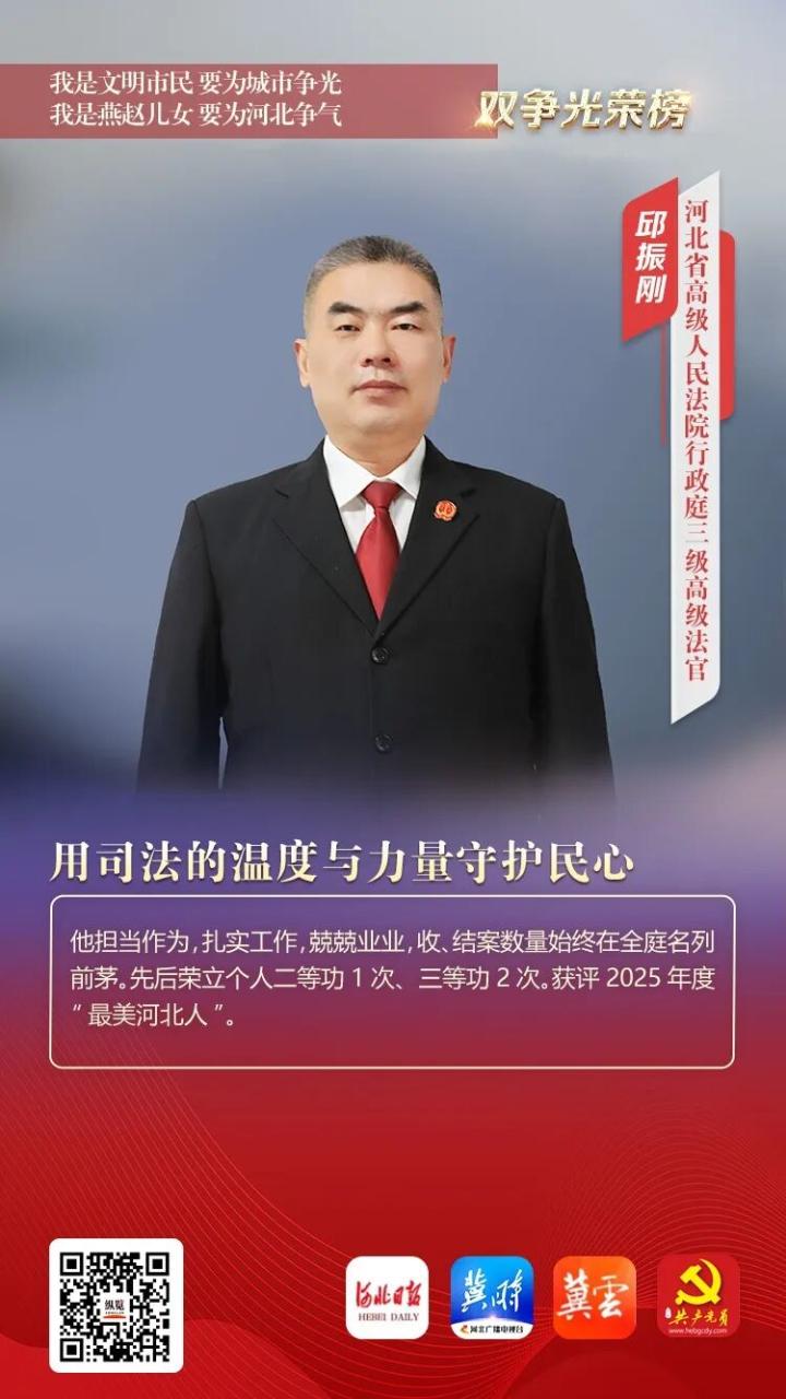 他担当作为,扎实工作,兢兢业业,收、结案数量始终在全庭名列前茅。先后荣立个人二等功1次、三等功2次。获评2025年度“最美河北人”。