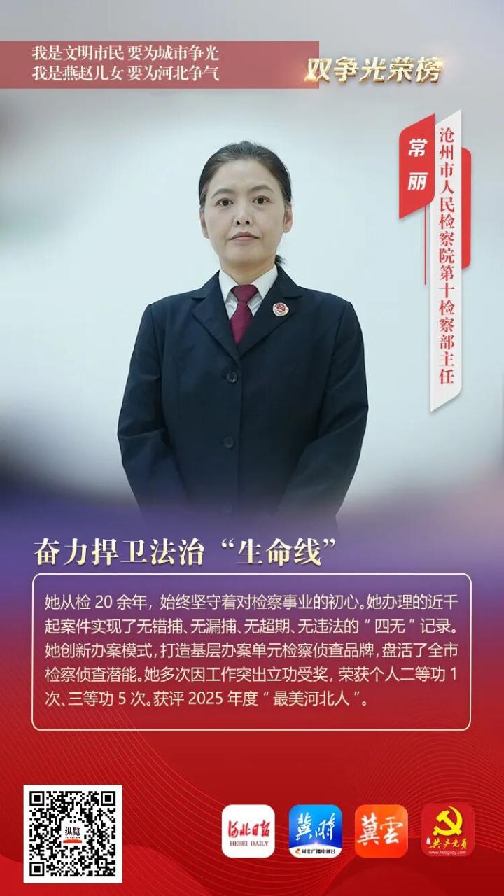 她从检20余年,始终坚守着对检察事业的初心。她办理的近千起案件实现了无错捕、无漏捕、无超期、无违法的“四无”记录。她创新办案模式,打造基层办案单元检察侦查品牌,盘活了全市检察侦查潜能。她多次因工作突出立功受奖,荣获个人二等功1次、三等功5次。获评2025年度“最美河北人”。