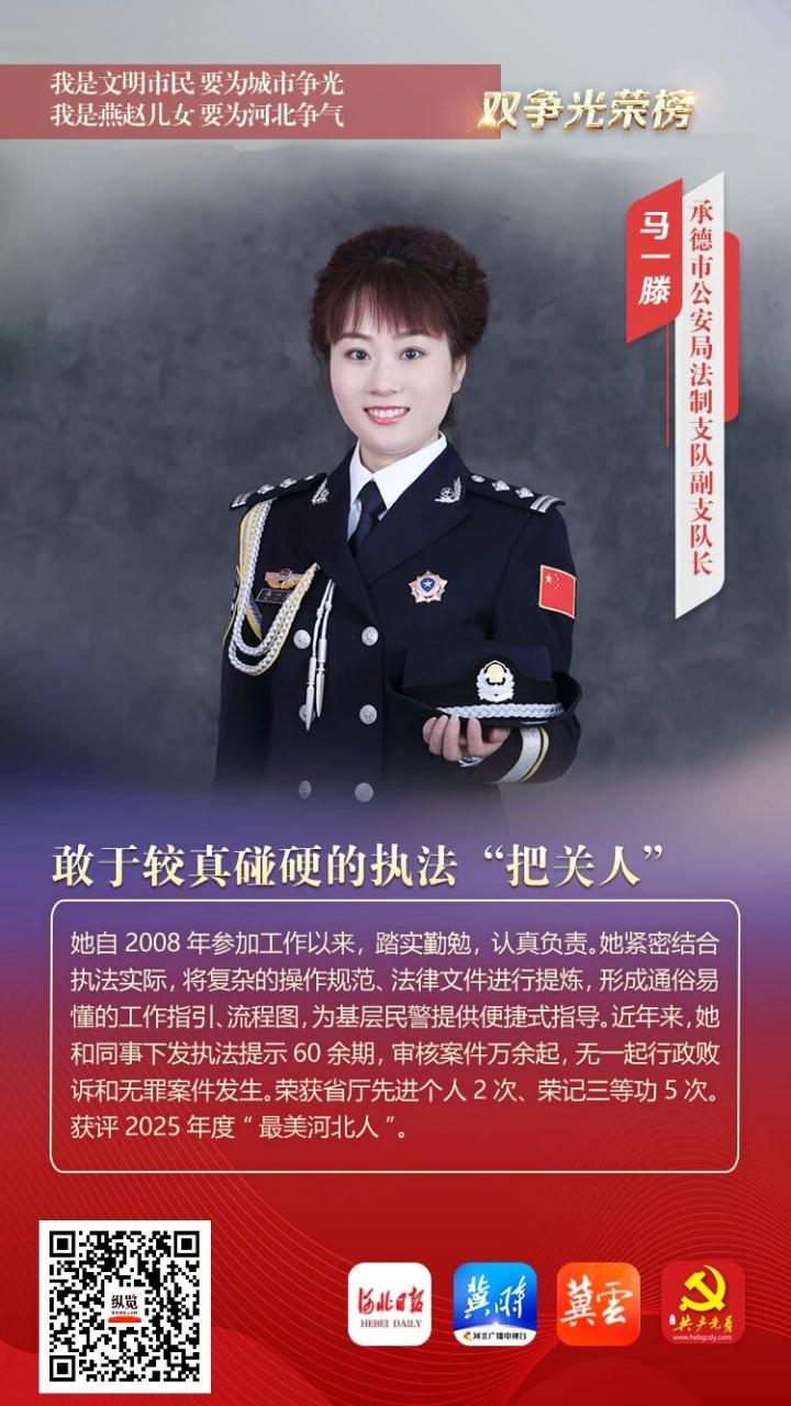 她自2008年参加工作以来,踏实勤勉,认真负责。她紧密结合执法实际,将复杂的操作规范、法律文件进行提炼,形成通俗易懂的工作指引、流程图,为基层民警提供便捷式指导。近年来,她和同事下发执法提示60余期,审核案件万余起,无一起行政败诉和无罪案件发生。荣获省厅先进个人2次、荣记三等功5次。获评2025年度“最美河北人”。