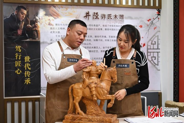 12月11日,许红阳和妻子在交流木雕技艺。河北日报记者 赵永辉摄