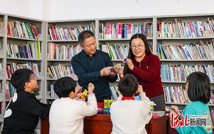 12月18日,在蔚县益海助学中心,孙秀梅与丈夫刘立新在教孩子们做手工。 河北日报记者 耿 辉摄